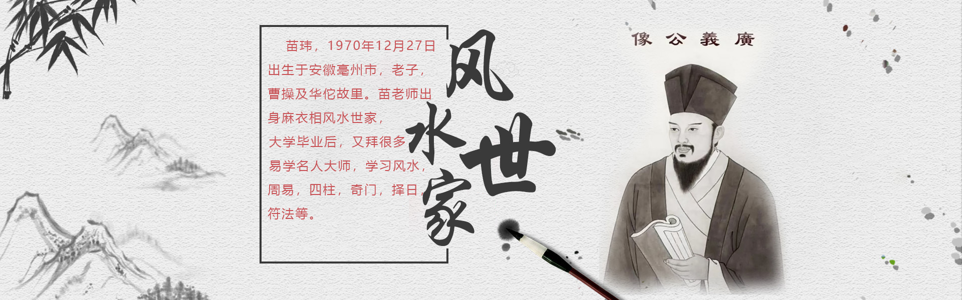 苗瑋,1970年12月27日,出生于安徽亳州市,老子,曹操及華佗故里。苗老師出身麻衣相風(fēng)水世家,受家庭影響,對風(fēng)水學(xué)有很大興趣,從小受爺爺父親熏陶學(xué)習(xí)風(fēng)水,大專畢業(yè)后,又拜很多易學(xué)名人大師。學(xué)習(xí)風(fēng)水,周易,四柱,奇門,擇日,符法等